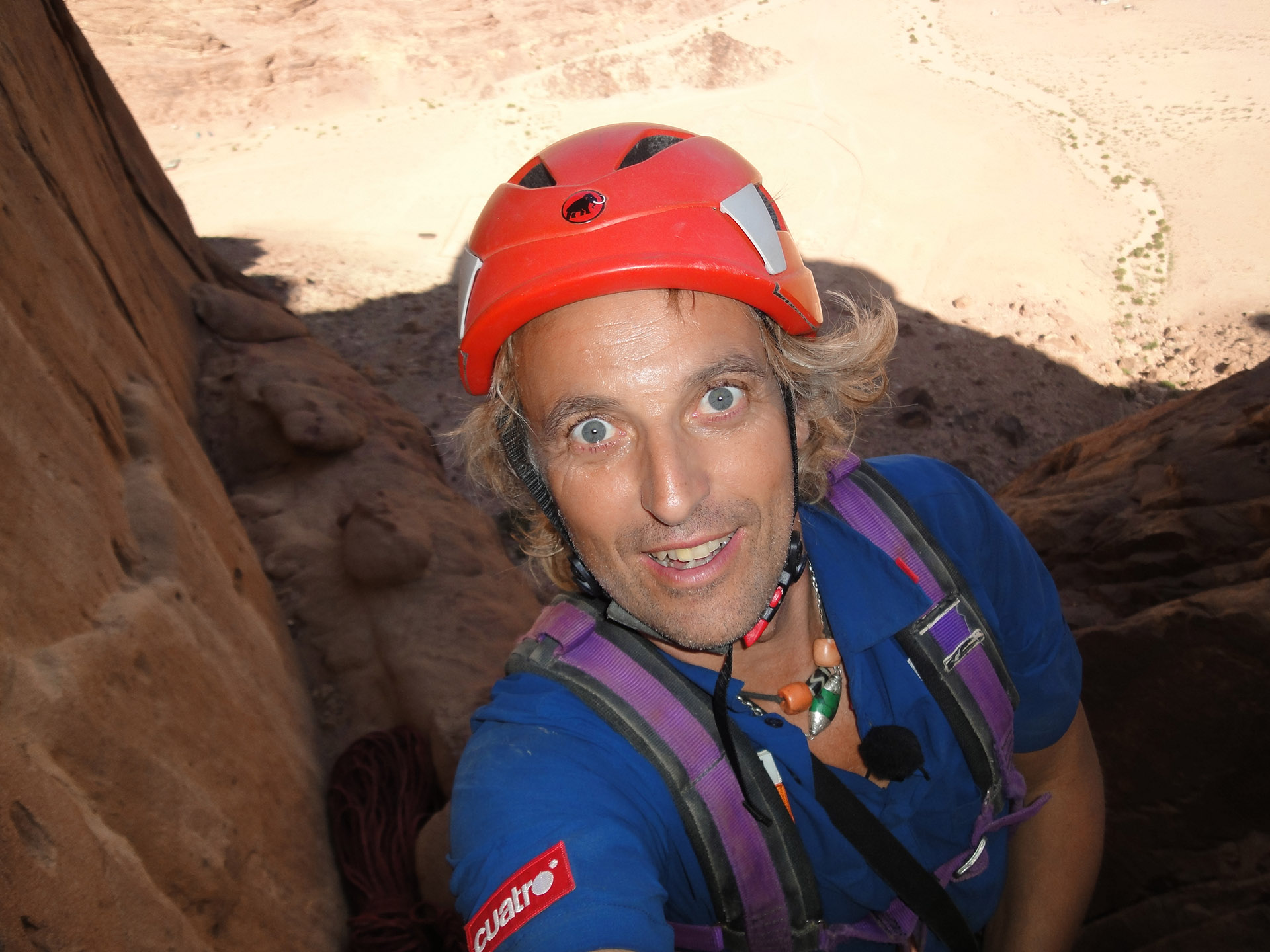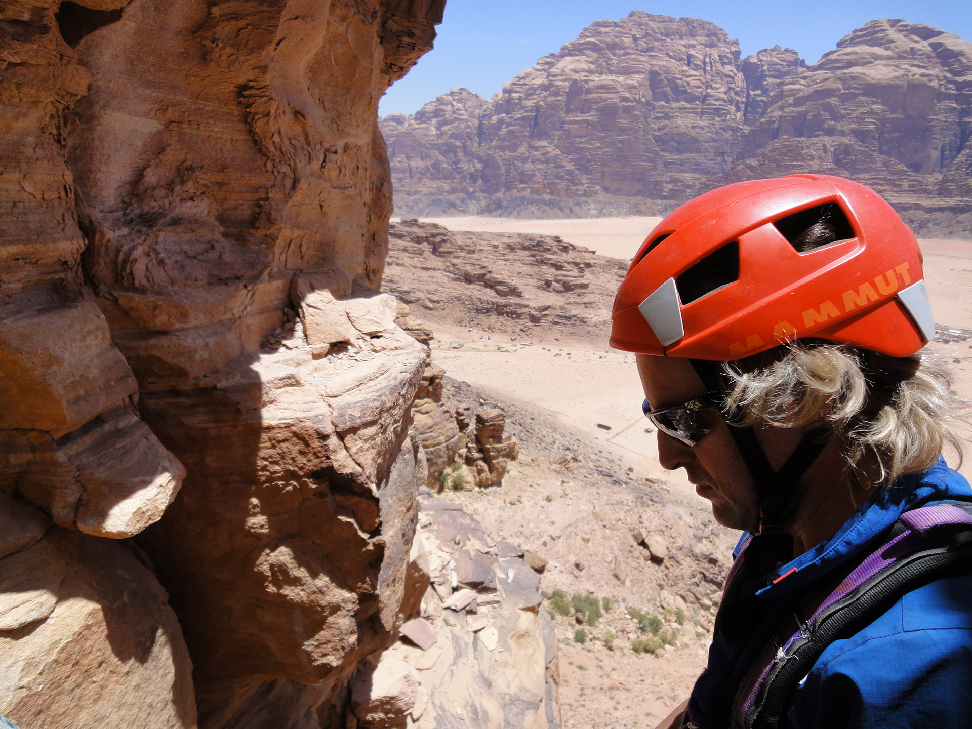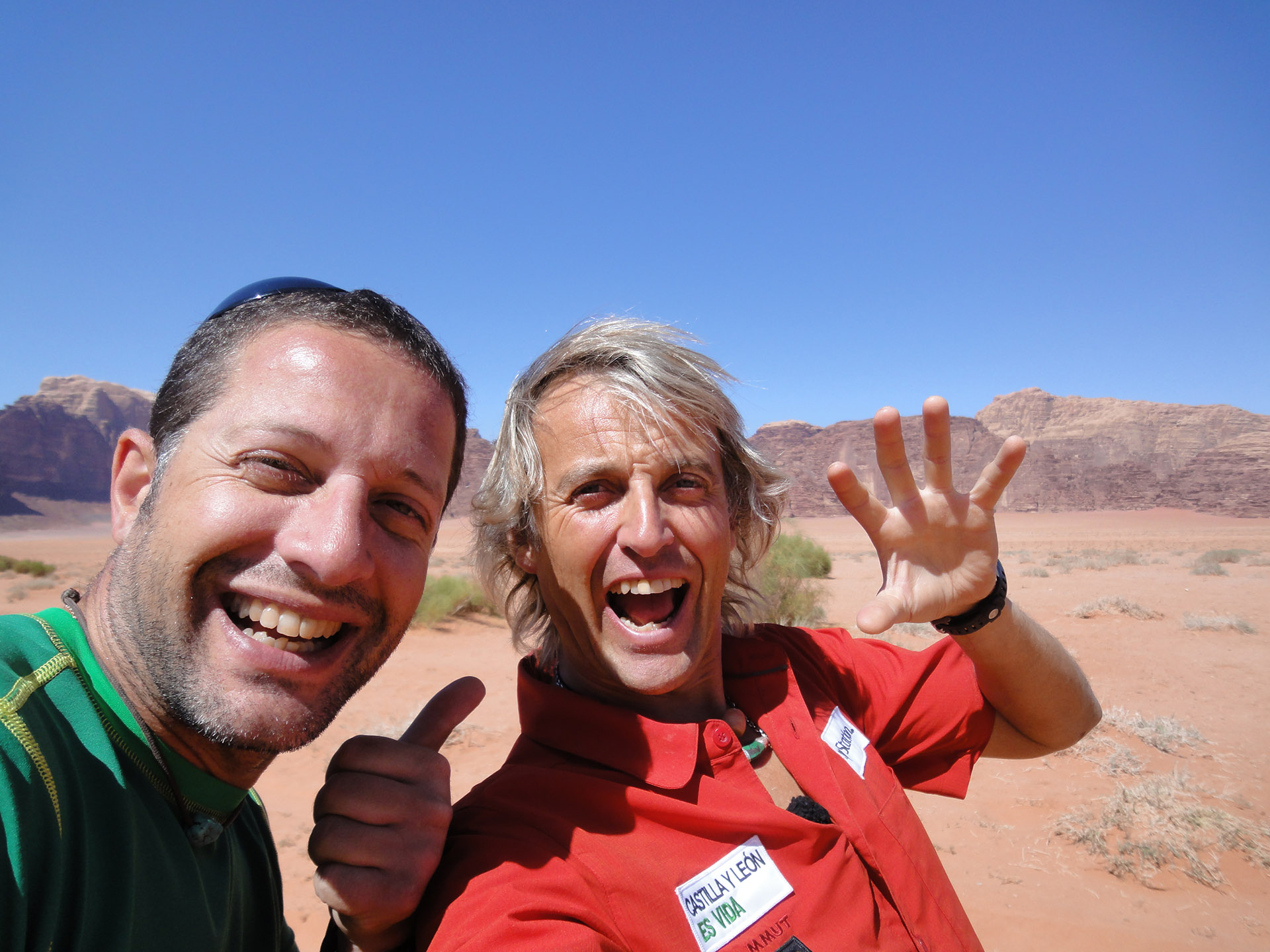 Bueno, amigos, acabamos prácticamente de volver de la vía “Inshallah Factor”, en el Jebel Rum, tras dos noches colgados en la pared y tres duros días de escalada. Agotados, extenuados... ¡pero enteros! La escalada ha sido mucho más compleja de lo que nos imaginábamos, sobre todo a Pelut, que es un número uno en el mundo del big wall, le ha sorprendido la magnitud del reto. Sabíamos de la dificultad de la pared Este del Jebel...