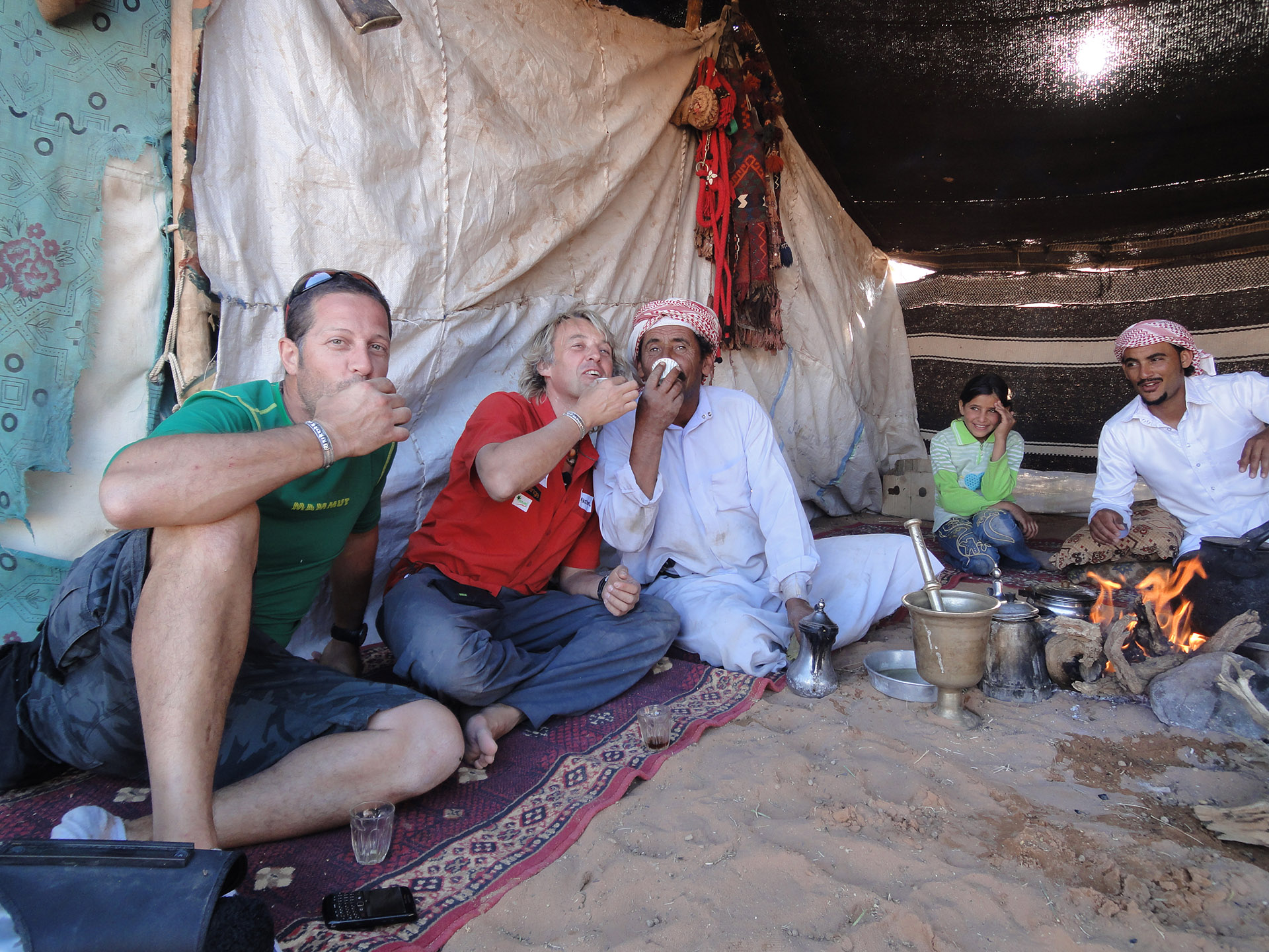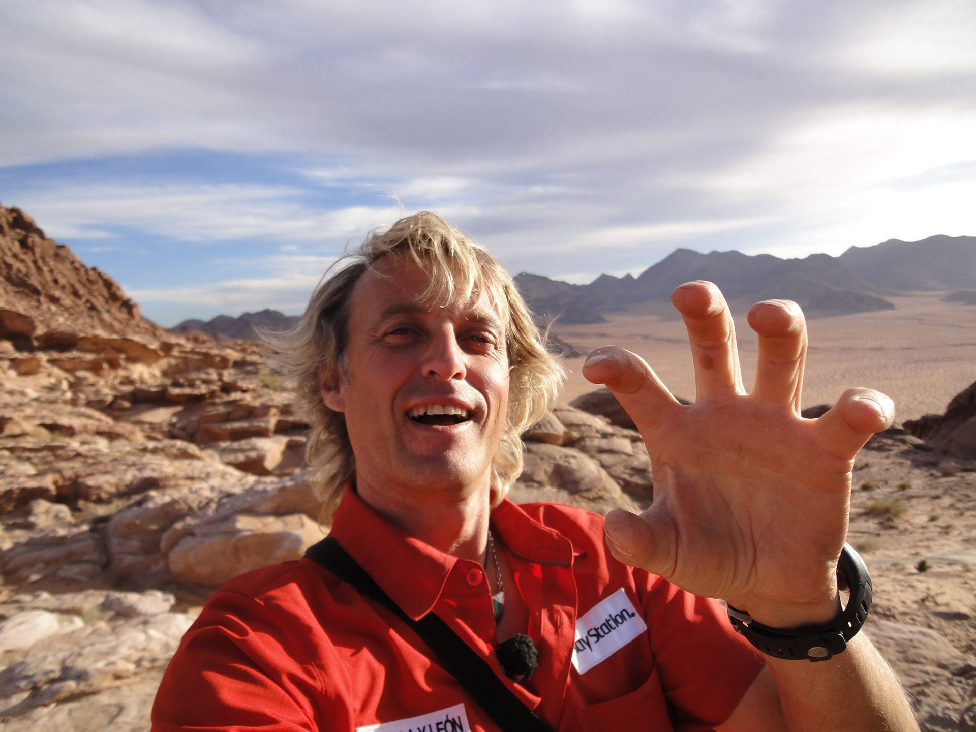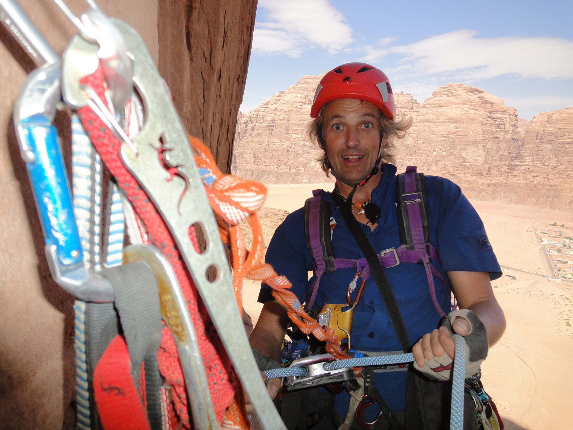 Bueno, amigos, acabamos prácticamente de volver de la vía “Inshallah Factor”, en el Jebel Rum, tras dos noches colgados en la pared y tres duros días de escalada. Agotados, extenuados... ¡pero enteros! La escalada ha sido mucho más compleja de lo que nos imaginábamos, sobre todo a Pelut, que es un número uno en el mundo del big wall, le ha sorprendido la magnitud del reto. Sabíamos de la dificultad de la pared Este del Jebel...
